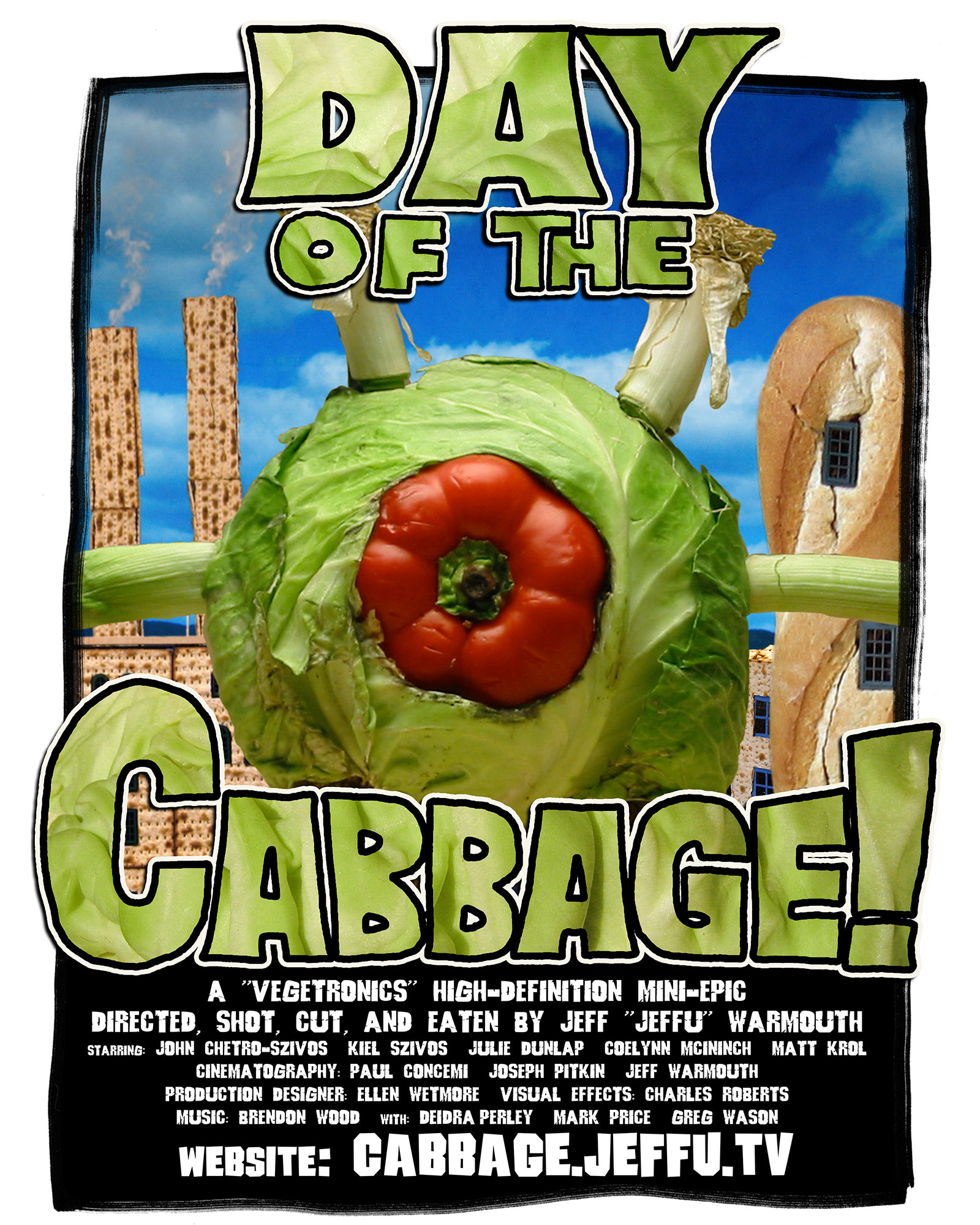 A giant-monster movie mini-epic with an all-vegetable cast, the third in a series of "Vegetronics" live-action mini-epics. Shot on HD with real food, live vegetable characters act in miniature sets with matzo buildings and graham cracker skylines. A mysterious cabbage meteor crash-lands in a toxic supercrunch site, mutating into a hideous monster that wreaks havoc on Matzoville. Young Billy Tomato discovers the creature and tries to warn his father Dr. Bell Pepper. Can Billy help Brandco corporation come up with a solution to save Matzoville from being flame-broiled out of existence?