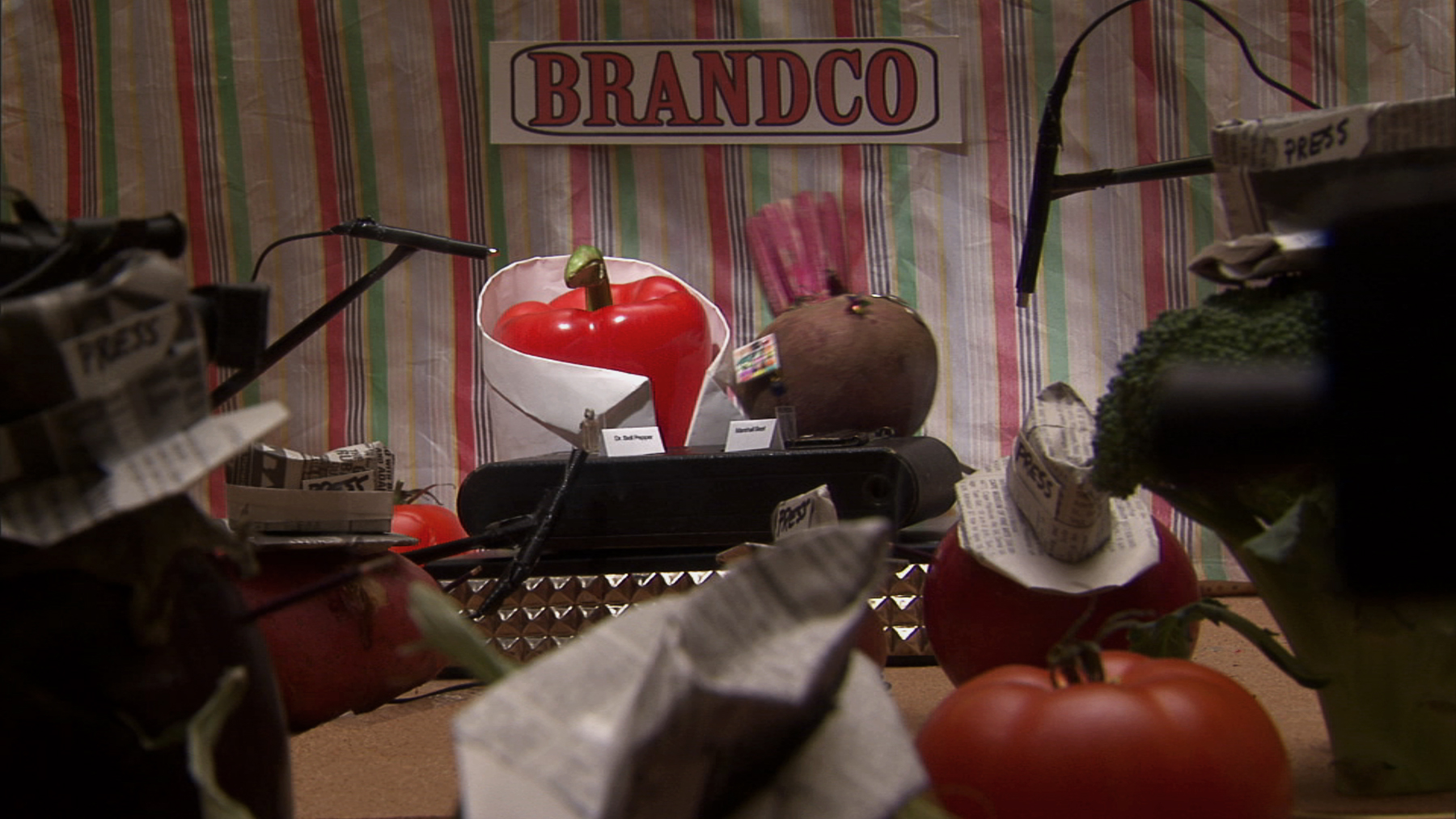 BrandCo Boardroom: Dr. Bell Pepper, Melon Brandco, and Marshall Beet, 2005, video still, pigment inkjet print, 9 x 16 inches