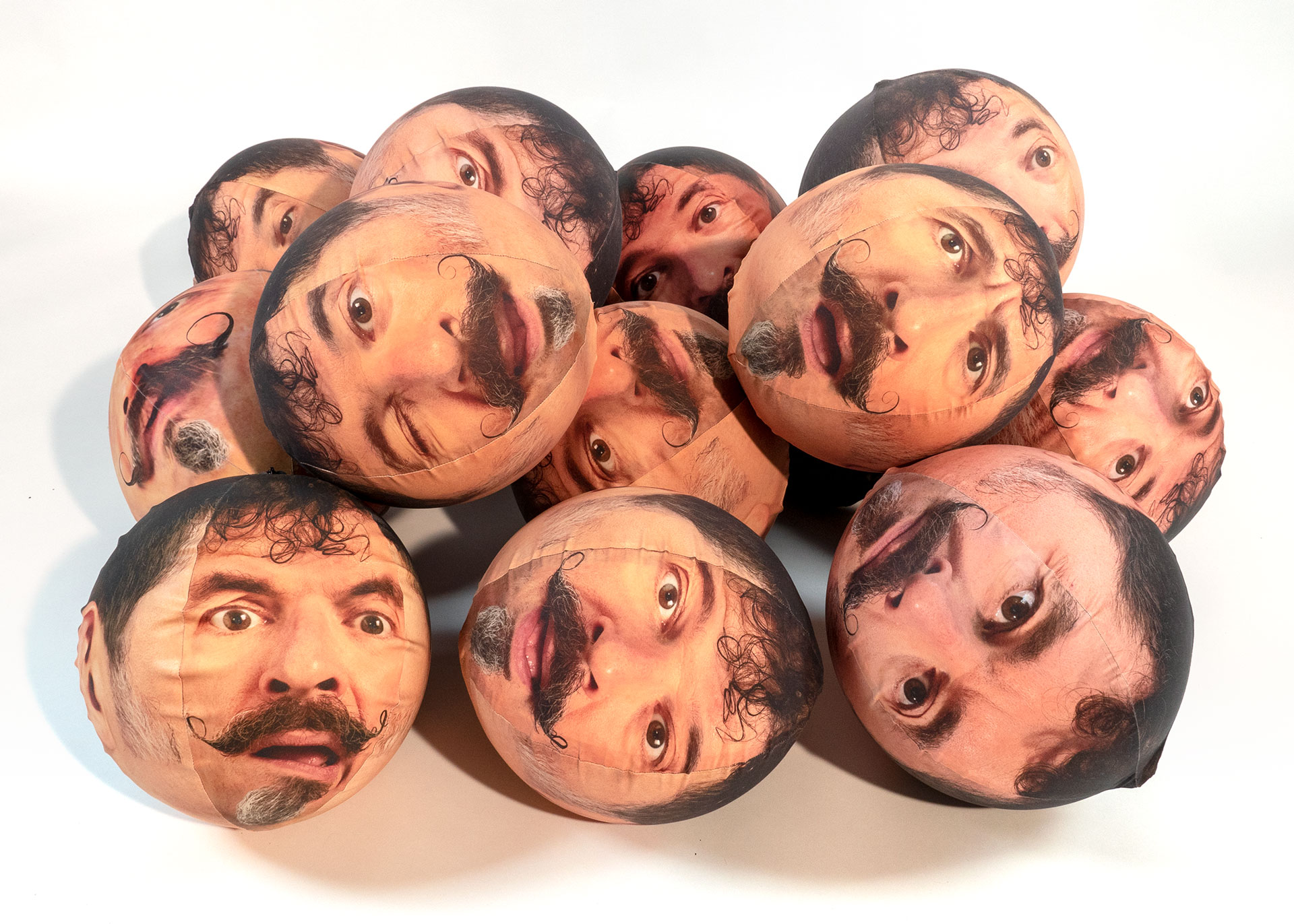 A ten-foot wide inflatable head, hollowed out and filled with dozens of smaller fabric heads, sewn from 3D photographic scans of the artist. Urgent Blowout amplifies our desire to fill, inflate, and replicate ourselves; we float around aimlessly bumping in one another, changing course based on wind currents, Black Friday sales, foreign influence, and cat GIFs; we may not know where we're going, but we remain desperate to get there quickly.